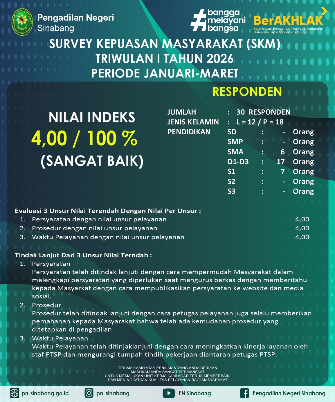 Berikut hasil survey Indeks Kepuasan Masyarakat yang diselenggarakan Pengadilan Negeri Sinabang.