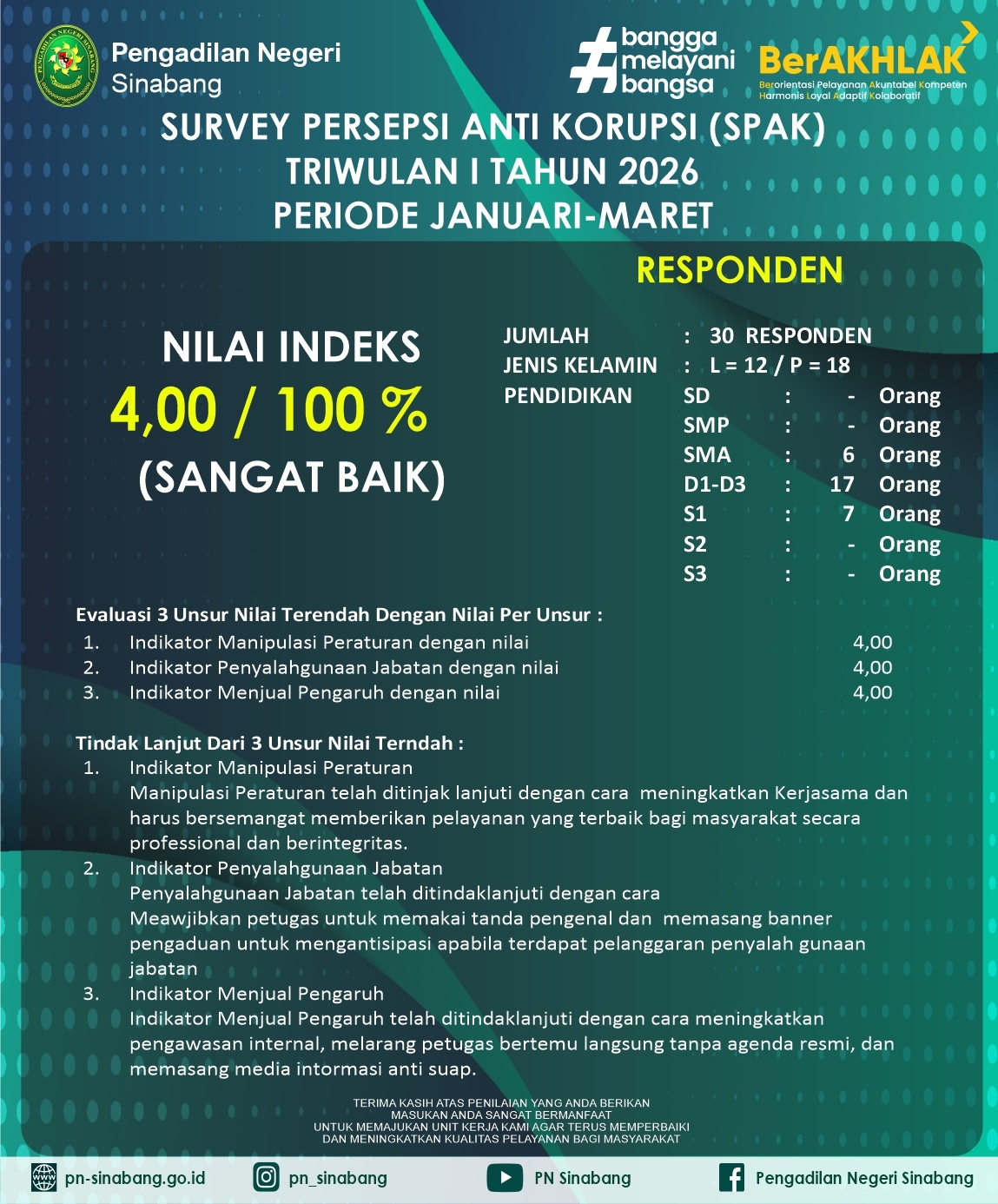 Berikut hasil survey Indeks Persepsi Korupsi yang diselenggarakan Pengadilan Negeri Sinabang.