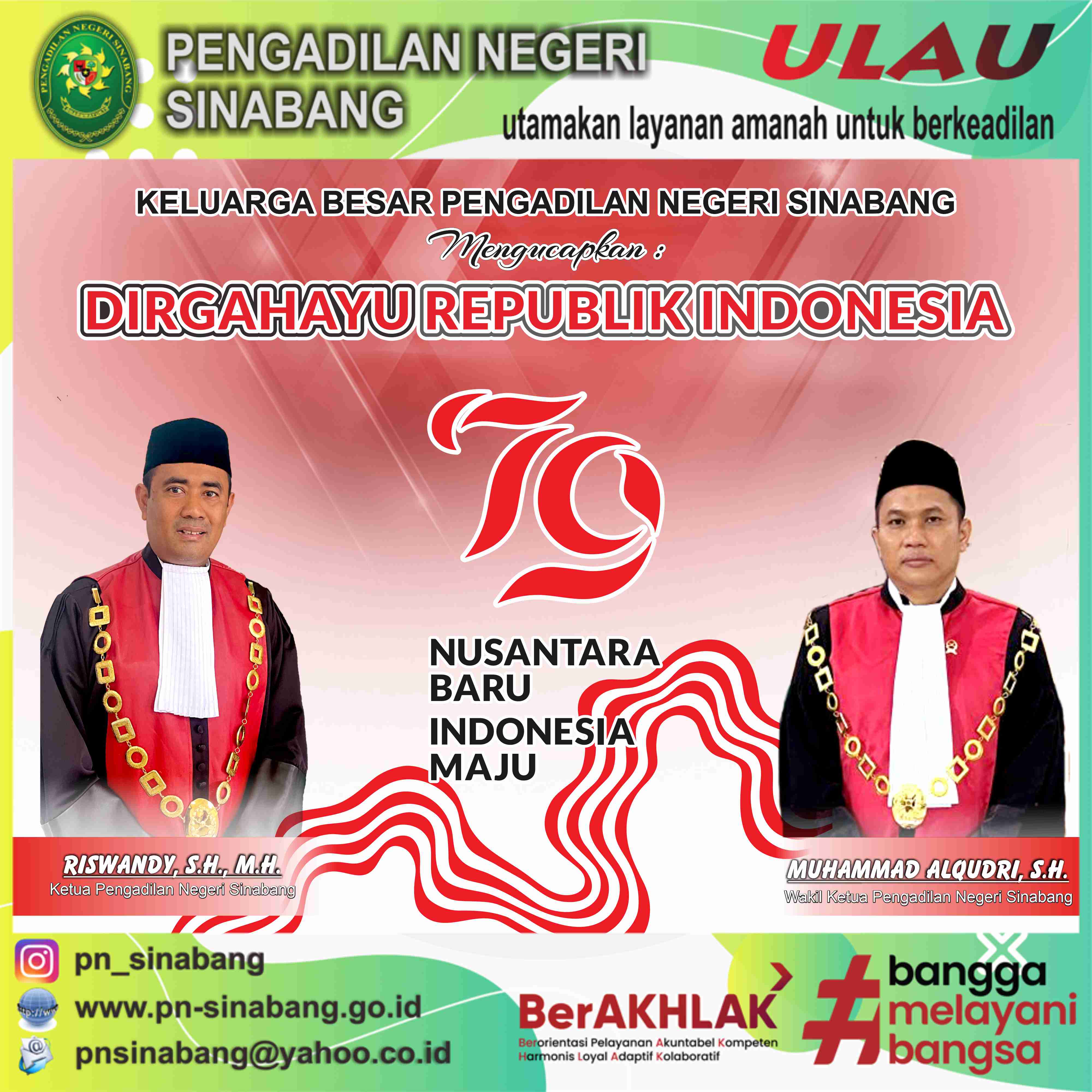 Sinabang-Humas: Yang Mulia Ketua Pengadilan Negeri Sinabang dan seluruh jajaran mengucapkan Dirgahayu Republik Indonesia yang ke-79, "Nusantara Baru, Indonesia Maju". Selengkapnya