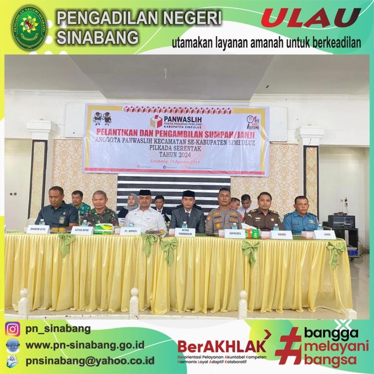 Sinabang-Humas]: (14/8/2024) Yang Mulia Ketua Pengadilan Negeri Sinabang menghadiri Kegiatan Pelantikan dan Pengambilan Sumpah Jabatan Anggota Panwaslih Kecamatan di Wilayah Kab. Simeulue .......