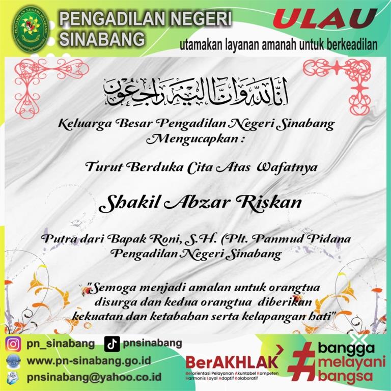 Keluarga Besar Pengadilan Negeri Sinabang Mengucapkan Turut Berduka Cita atas Meninggalnya "Shakil Abzar Riskan" Putra dari Bpk. Roni, S.H. Plt Panmud Pidana .......