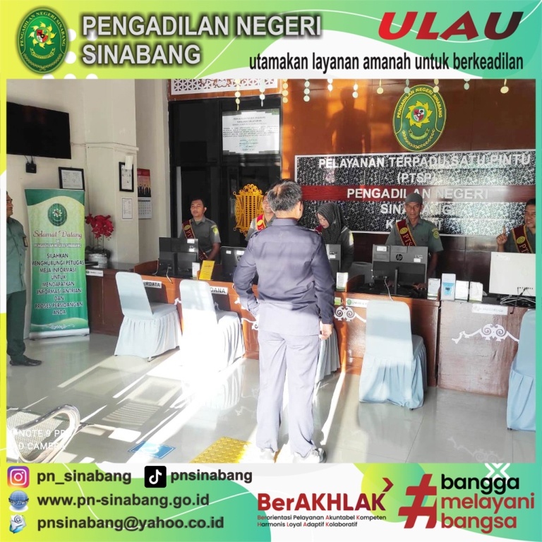 (26/02/2025) Pelaksanaan Briefing Pelayanan Terpadu Satu Pintu (PTSP) pada Pengadilan Negeri Sinabang yang dilakukan oleh Panitera Pengadilan Negeri Sinabang Bpk. Ayon Aurifan, S.H. yang merupakan Penanggungjawab Pelayanan PTSP pada hari tersebut serta diikuti oleh Para Petugas Layanan PTSP dan Petugas keamanan Pengadilan Negeri Sinabang.