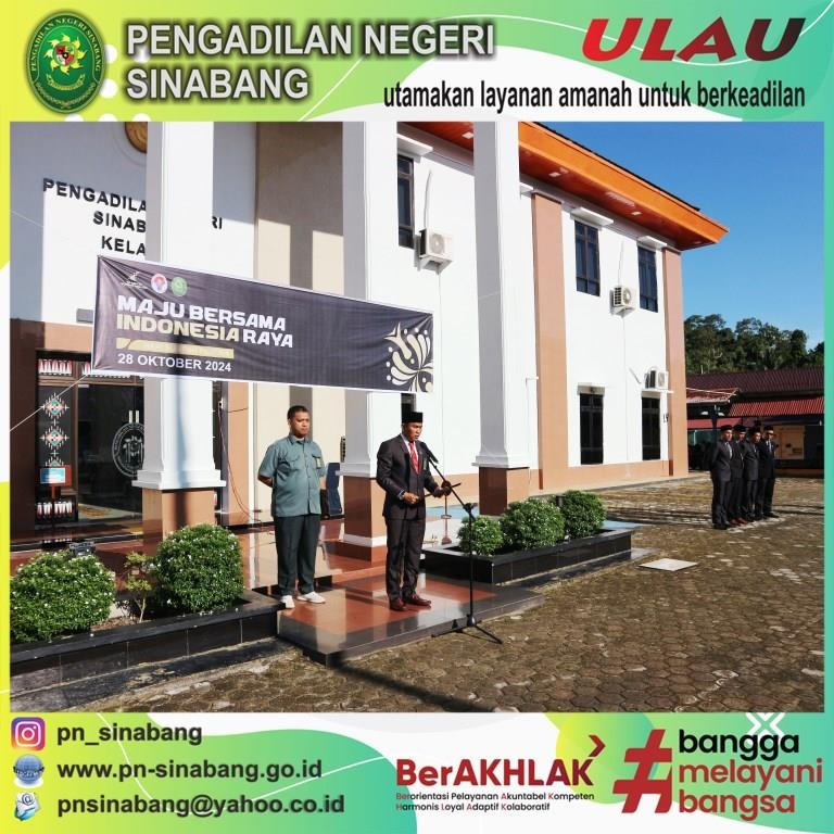 Pengadilan Negeri Sinabang melaksanakan upacara Peringatan Hari Sumpah Pemuda Yang Ke-96 Tahun, dan bertindak sebagai Pembina Upacara yaitu Yang Mulia Wakil Ketua Pengadilan Negeri Sinabang Bpk. Muhammad Alqudri, S.H. dan yang bertugas sebagai Komandan Upacara yaitu Sdr. Hairul Mardi.