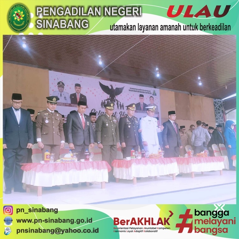 Pada hari Selasa, 1 Oktober 2024 Yang Mulia Ketua Pengadilan Negeri Sinabang, Bpk. Riswandy, S.H., M.H. menghadiri langsung upacara bendera dalam rangka Peringatan Hari Kesaktian Pancasila Tahun 2024, yang dilaksanakan di Lapangan Alun-alun Pendopo Kabupaten Simeulue. Kegiatan ini juga dihadiri oleh unsur forkopimda dan stakeholder terkait pada Kabupaten Simeulue.