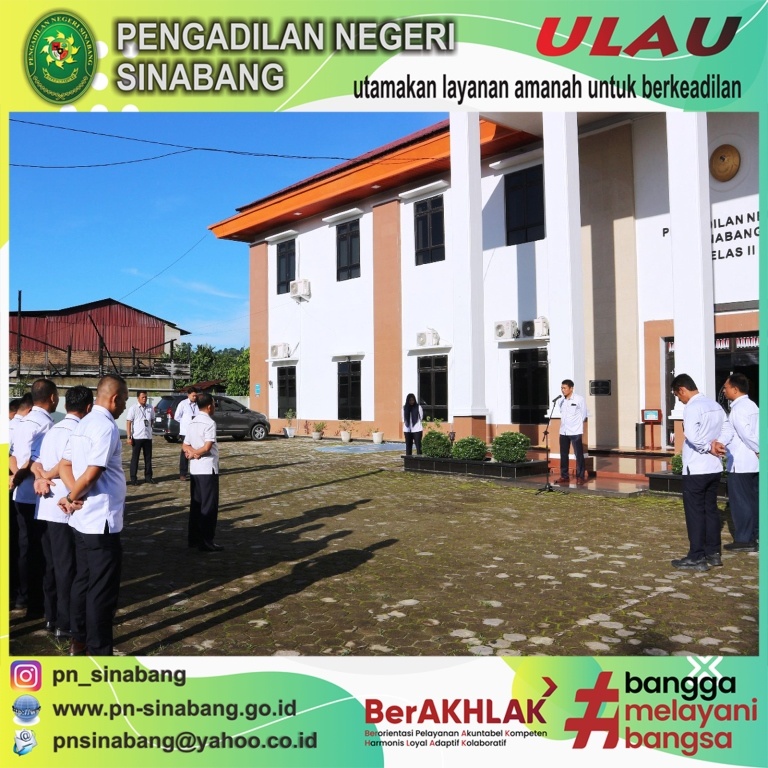 Senin, 23 September 2024 telah dilaksanakan kegiatan Apel Pagi dengan Pembina Apel yakni Bpk. Muhammad Alqudri, S.H. selaku Wakil Ketua Pengadilan Negeri Sinabang, adapun peserta kegiatan Apel Pagi tersebut diikuti oleh Ketua, Para Hakim, Panitera, Sekretaris, Para Pejabat Struktural, dan Fungsional, beserta seluruh Staf pada Pengadilan Negeri Sinabang.