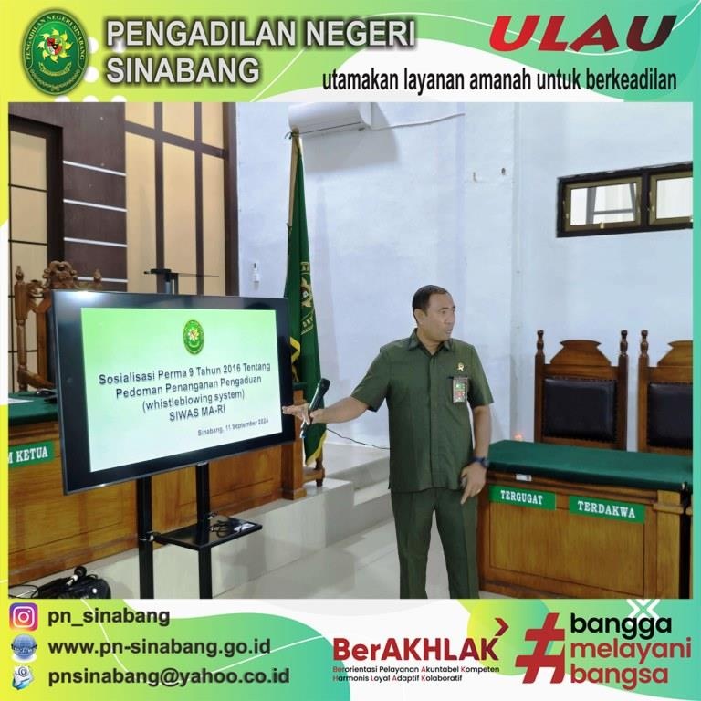 Rabu, 11 September 2024, Pengadilan Negeri Sinabang melaksanakan kegiatan Sosialisasi Peraturan Mahkamah Agung RI No. 7, 8, 9 Tahun 2016 yang disampaikan oleh Yang Mulia Ketua Pengadilan Negeri Sinabang, Bpk. Riswandy, S.H. dan Sosialisasi Coret Value ASN Ber-AKHLAK yang disampaikan oleh Yang Mulia Wakil Ketua Pengadilan Negeri Sinabang, Bpk. Qudri, S.H.