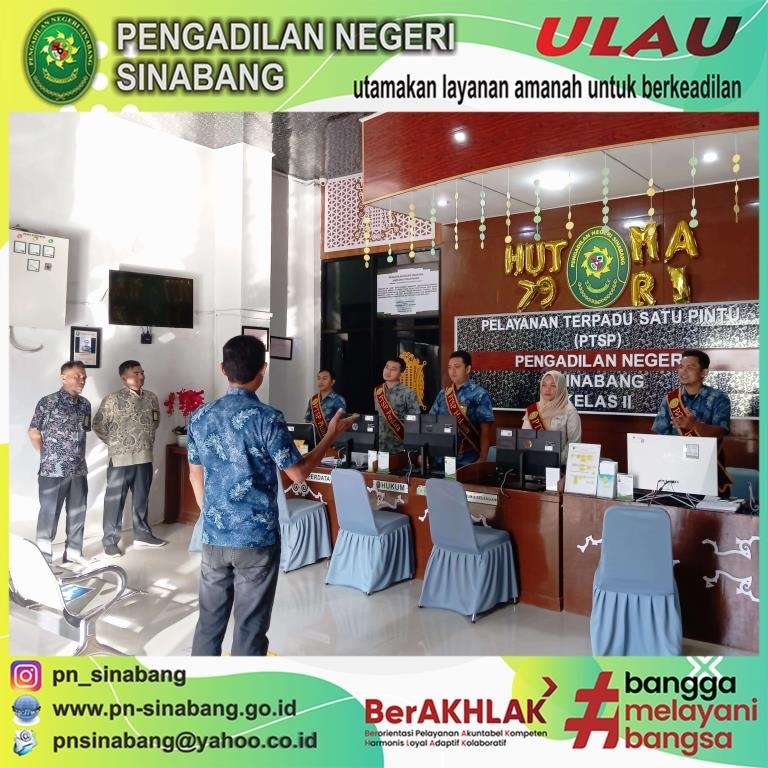 (22/8/2024) Pelaksanaan Briefing Pelayanan Terpadu Satu Pintu (PTSP) pada Pengadilan Negeri Sinabang yang dilakukan oleh Panmud Hukum Pengadilan Negeri Sinabang Bpk. Mulyadi, A.Md. yang merupakan penanggungjawab pelayanan PTSP Pengadilan pada hari tersebut serta diikuti oleh Para Petugas Layanan PTSP dan Petugas keamanan PN Sinabang.