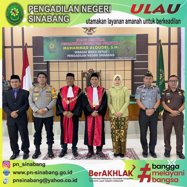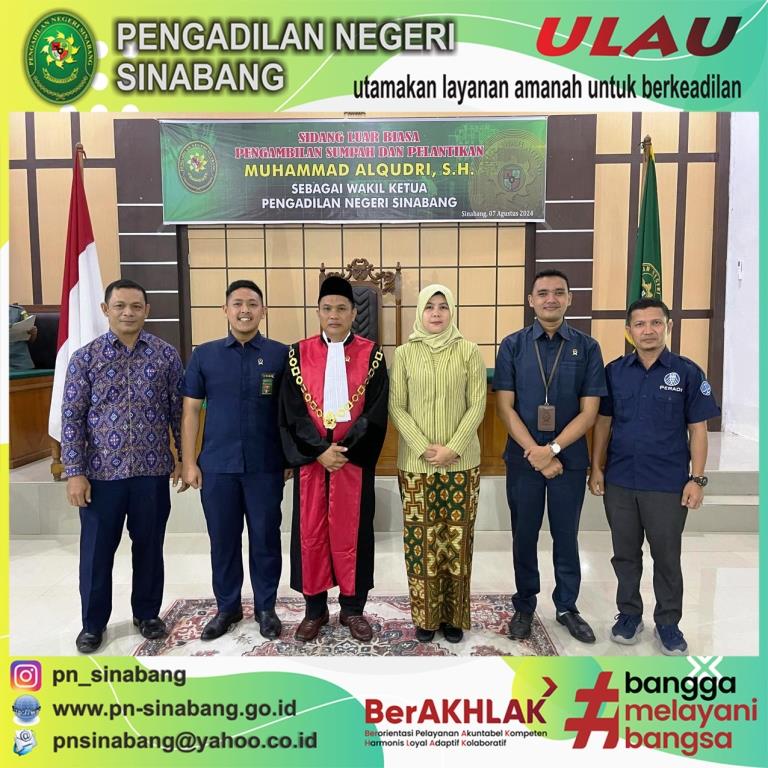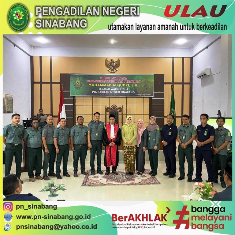 Rabu, 7 Agustus 2024, Yang Mulia Ketua Pengadilan Negeri Sinabang Bapak Riswandy, S.H., M.H. melantik dan mengambil Sumpah Bapak Muhammad Alqudri, S.H. sebagai Wakil Ketua Pengadilan Negeri Sinabang yang diangkat berdasarkan SK Ketua Mahkamah Agung.