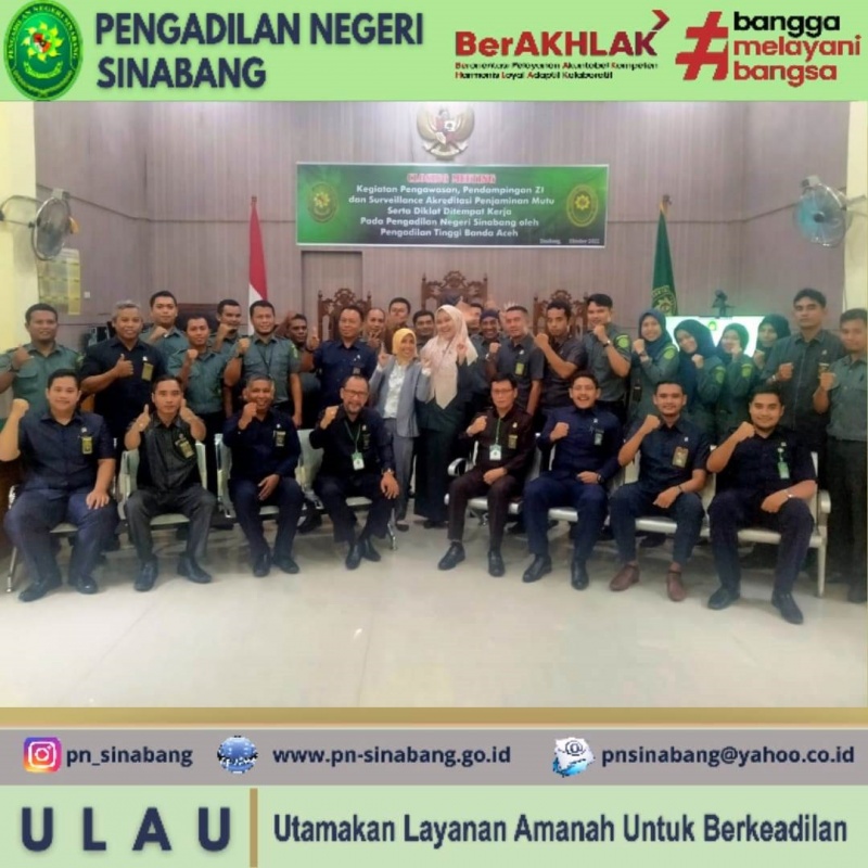 Foto bersama Seluruh Warga Pengadilan Negeri Sinabang dengan Tim Assesor dari Pengadilan Tinggi Banda Aceh dalam kegiatan Closing Meeting Pengawasan, Pendampingan ZI dan Surveillance Akreditasi Penjaminan Mutu, serta Diklat di Tempat Kerja.